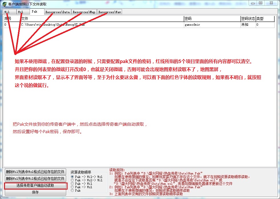 2. Pak文件需要放在客户端对应的“Resources\Data”目录里,如果不想放在“Resources”,可以在配置里修改“Resources”目录名称,默认使用“Resources”目录.例如:如果“Resources\Data\Hum.Pak”文件存在,就不会再读取“Data\Hum.wzl”